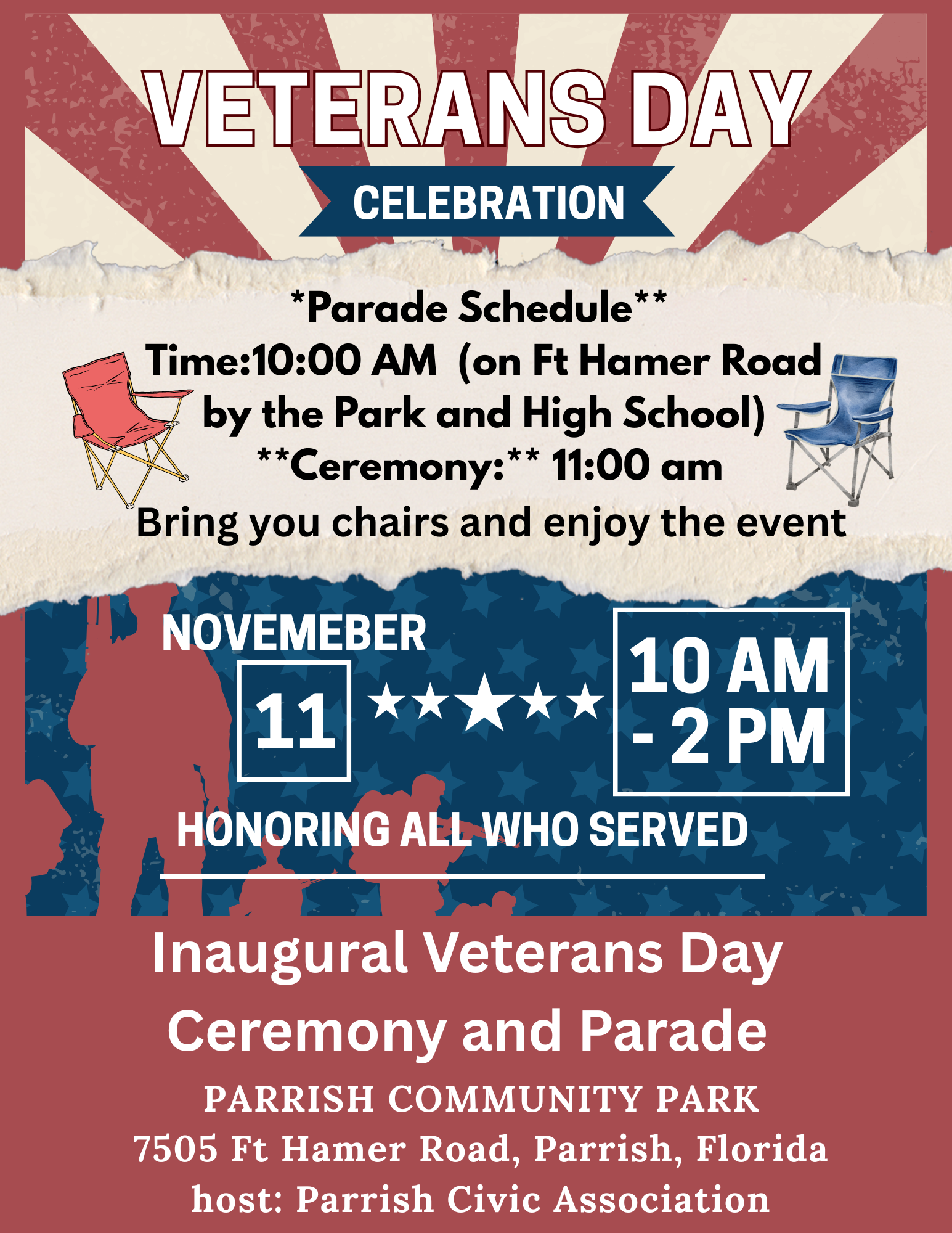 DESCRIPTION:Parrish Civic Association is Proud to invite you to Honor All Who Served this Veterans Day.The parade will be on Ft Hamer Road by the Park and High School starting at 10:00am.The ceremony to honor or Veterans 11:00 am.Bring you chairs and enjoy the event!We are looking for entries that will both honor our local veterans as well as entertain the public! We welcome:  Bands  Dance/Drill Teams  Organizations  Churches  Groups Marching  Floats  Clowns   Car/Motorcycle Clubs  Youth/Toddler Groups  Women/Men Clubs  Marching Bands  Pet Clubs *Please allow up to 10 days for response regarding approval of participation.*Deadline to submit registration form is NOVEMBER 1\, 2025.CLICK HERE to register to be in the Parade